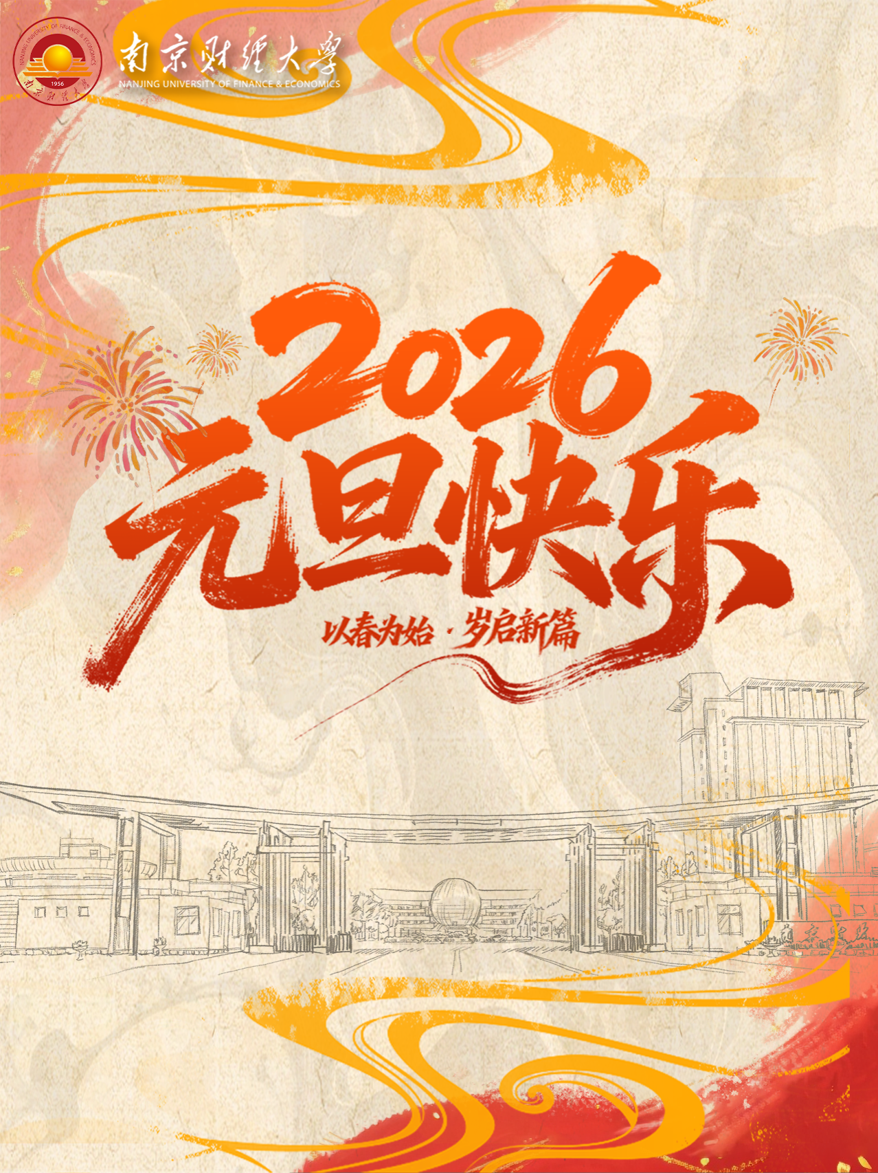 2026年是“十五五”规划开局之年,也是学校建校70周年,我们将以此为新起点,初心不渝、接续奋斗,书写跨越式发展的全新篇章。征途漫漫,惟有奋斗;梦想熠熠,全靠实干。“十五五”蓝图已然铺开,让我们更加紧密地团结在以习近平同志为核心的党中央周围,以“功成不必在我”的精神境界和“功成必定有我”的历史担当,以“咬定青山不放松”的执着韧劲和“敢教日月换新天”的昂扬斗志,同心同德,锐意进取,为学校早日跻身国家“双一流”建设行列,加快建成国内一流的高水平财经大学而不懈奋斗,为强国建设、民族复兴,为江苏“在推进中国式现代化中走在前、做示范”作出新的更大贡献!