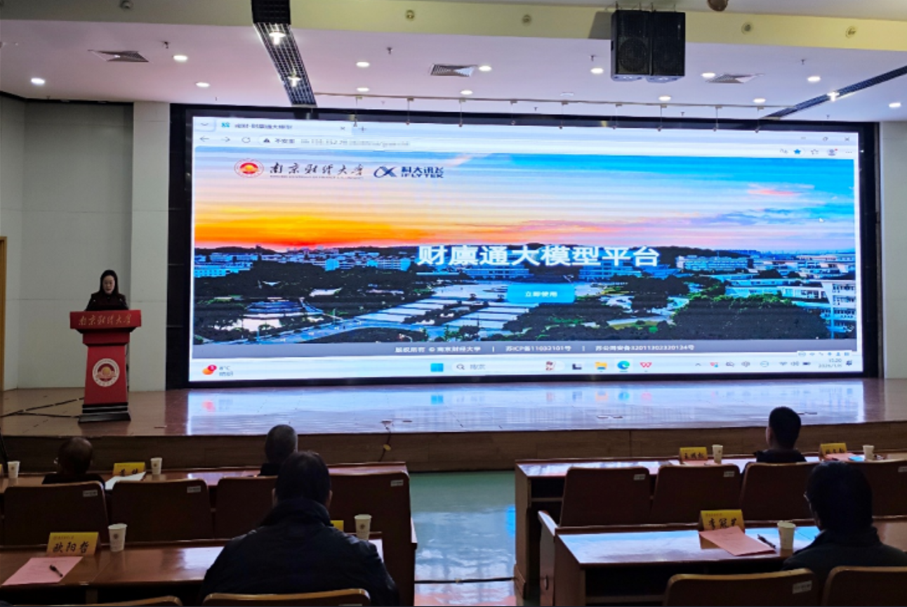 1月8日,我校发布国内首个粮食安全学科专用大模型“财廪通”,该模型由我校与科大讯飞共同研发。党委常委、副校长姚文韵,科大讯飞江苏大区高教行业总监王明松出席发布会并致辞。科大讯飞江苏大区高教客户经理陈志全,研究生院、教务处、金融学院、国际经贸学院、会计学院、工商管理学院、食品科学与工程学院、计算机与人工智能学院等相关单位领导,以及人工智能前沿交叉学院“人工智能+”实验班2025级全体学生参加发布会。发布会由学科建设办公室主任、人工智能前沿交叉学院执行院长赵霞主持。