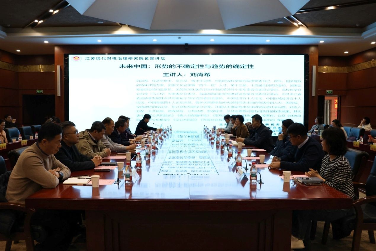 12月4日,由我校主办、江苏现代财税治理研究院承办的“学习贯彻党的二十届四中全会精神 财税政策推动新质生产力发展”论坛在仙林校区工科楼二楼报告厅举行。中国财政科学研究院原党委书记、院长,经济学家刘尚希应邀作学术报告。我校党委常委、统战部部长李玉琴,江苏省注册税务师协会秘书长金有国,江苏省政府研究室原副主任沈和,会计学院院长李翔,公共管理学院院长黄建伟,梅西学院副院长(主持工作)陆颖健,江苏现代财税治理研究院首席专家张成,党委统战部副部长王鑫,财政与税务学院师生代表参加论坛。论坛由财政与税务学院副院长(主持工作)管永昊主持。