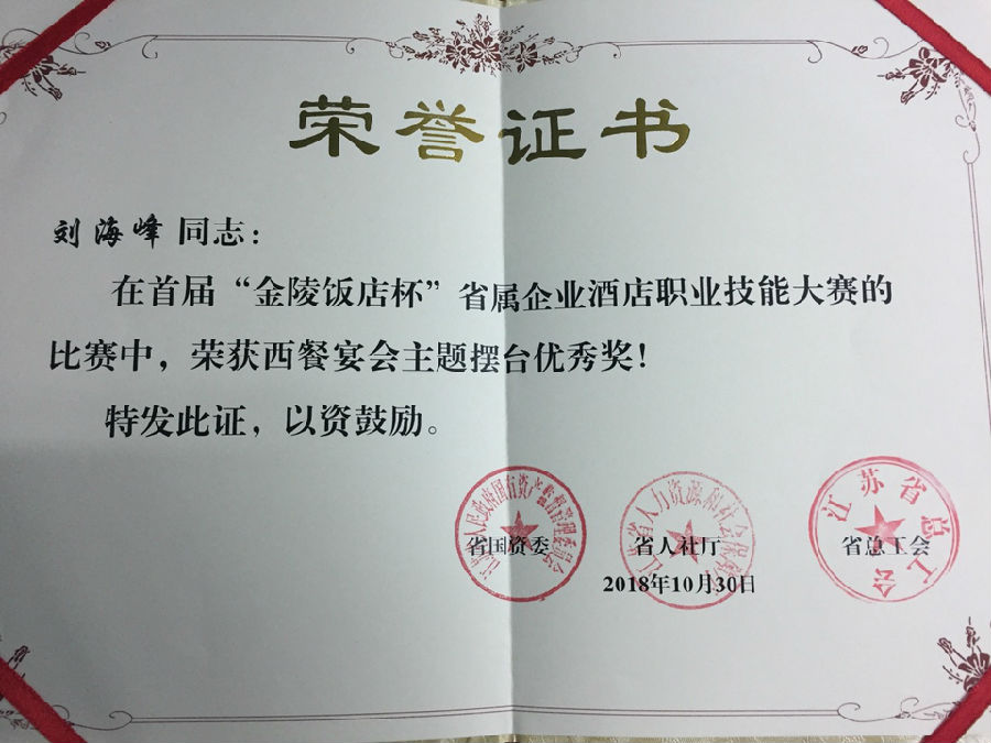 10月30日,首届“金陵饭店杯”省属企业酒店职业技能大赛在南京落幕。比赛由江苏省国资委、江苏省人社厅、江苏省总工会主办,金陵饭店集团承办。经过激烈竞争,我校工商管理学院旅游管理专业刘海峰同学荣获西餐宴会主题摆台优秀奖。