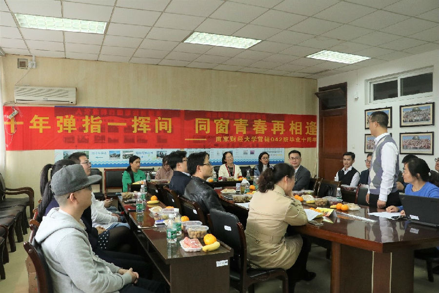 11月3日下午,市场营销专业042班校友毕业十周年座谈会在仙林校区德业楼535会议室举行。营销与物流管理学院院长倪明、党委副书记周进进、教师任晓峰和校友们欢聚一堂。座谈会由学工办仲巧林老师主持。