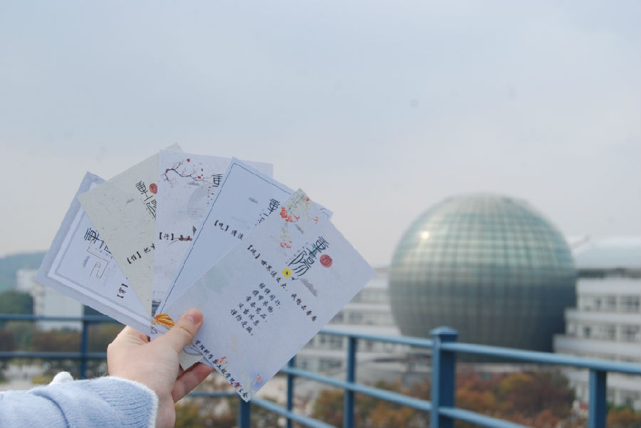 管工院学生会部分成员来到德济楼五楼草坪,他们将养生卡摆出扇形、“九”字等造型进行拍摄,这些造型寓意着幸福美满的美好愿望。随后,大家将卡片送给管理科学与工程学院党总支书记张圣兵、任课老教师、宿管阿姨等,祝愿长辈重阳节快乐!