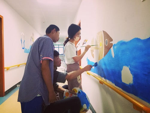 福利院儿童和志愿者一起画墙绘