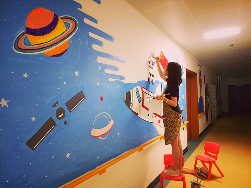 在志愿者近一周的辛勤劳作下,一幅幅色彩鲜明、主题突出的墙画呈现在孩子们眼前,深蓝色的海洋、雅蓝色的外太空、可爱的机器猫、百变的超级英雄、粉红的萌宠系、甜美的公主系,不同的设计风格深得男孩女孩们的喜爱。最亮眼的是以孩子们为原型精心设计的卡通版全家福,画面温馨可爱,孩子们自豪地说“这个是我”。精彩的画作不仅给孩子带来了视觉上的享受,更是给了他们心理上的温暖,栩栩如生的画面人物就像是陪伴在孩子身边的小伙伴,时时刻刻守护着他们成长。