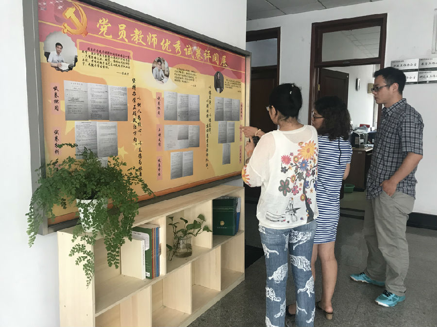 此次评阅展展出了朱军、张秀莲、蒋兆才三位党员教师的试卷批阅情况和平时成绩记录、试卷分析。阅卷卷面规范细致,得分点明确,平时成绩记录准确,试卷分析客观精准,有说服力。试卷评阅展出后,学院教师踊跃观看、拍照,为即将到来的试卷评阅工作做准备。