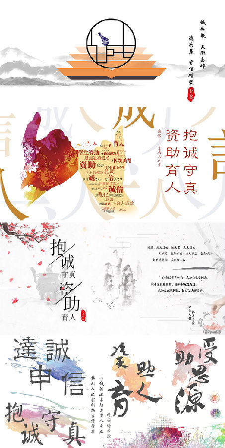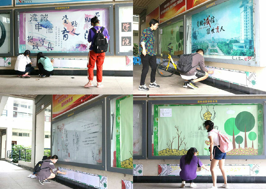 其中,金融学院作品以“抱诚守真,资助育人”为主题,配以哲思语句,倡导学生积善存爱;财政与税务学院作品以“瓶”“基”为喻,引发诚与德的平衡思考;国际经贸学院作品以树为主要元素,强调诚信守约的重要性;管理科学与工程学院作品以漫画形式,引领人们不忘初心;经济学院作品以校园风貌为背景,融入南财因素,倡导诚信风尚;食品科学与工程学院作品简约、主题突出,凸显诚信内涵。