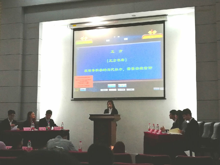 本次决赛中,正方与反方围绕“在信奉科学的当代还需不需要宗教信仰”这一辩题据理力争,展开了精彩的辩论。正方一辩开门见山,指出宗教信仰有存在的必要,因为人不全是理性的,而宗教能带给人精神的慰藉;而反方一辩根据正方的观点,提出了针对性的问题,并表示正方的假设太过理想化。在紧接着的各自陈词中,双方都向对方发动了“奇袭”,现场气氛迅速热烈起来。正方辩手随机应变,联合生活实际举出事例,反方辩手旁征博引,以史为鉴。双方出色的口才和敏捷的才思赢得观众阵阵热烈的掌声。在观众提问环节中,辩手们针对不同的提问迅速做出合理的解答。