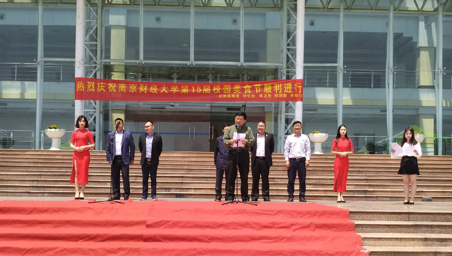 现场领导分发写有“南京财经大学第15届与食共舞美食节”字样的蛋糕,宣布开启美食一条街。