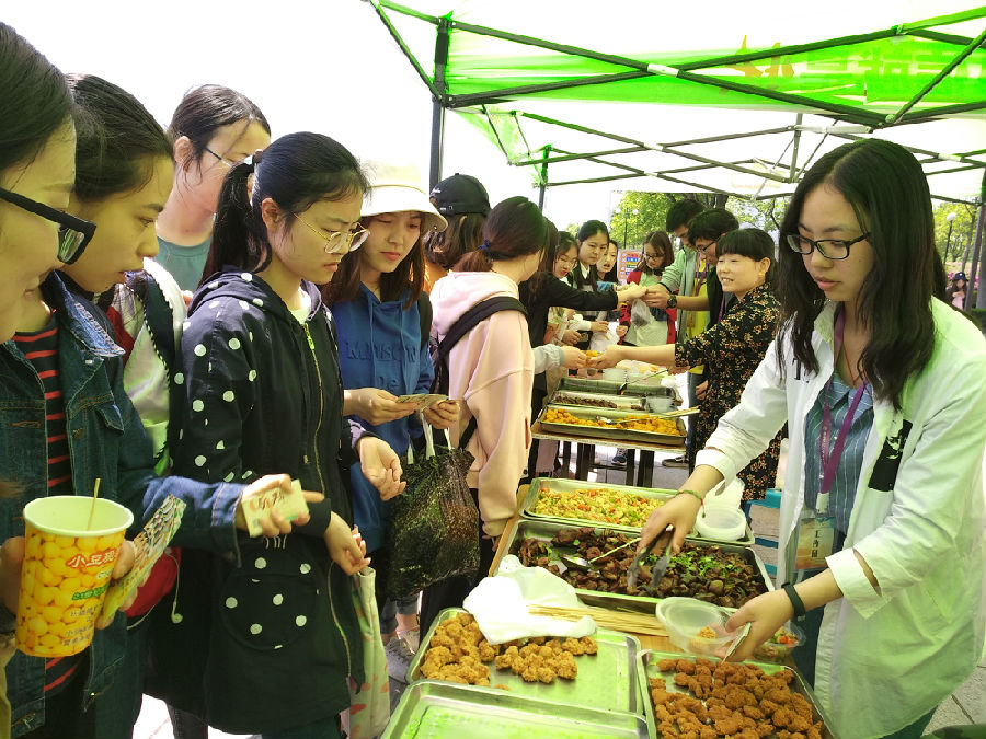 现场动感的音乐触发了同学们的食欲,香甜可口的蛋糕和甜腻软糯的小包子富有粉色浪漫气息,香味四溢的油炸小吃和色味俱佳的特色炒菜是同学们的最爱……参与活动的老师也在热闹的气氛中品尝着美食,与同学们共同享受一段美好的午后时光。