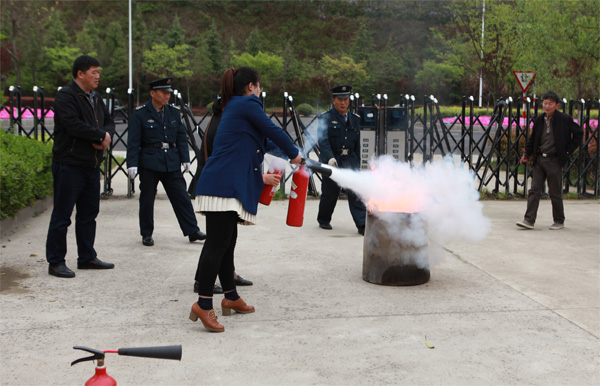 现场培训结束后,全体人员到食工楼前消防演练现场,实际操作演练灭火器的使用。