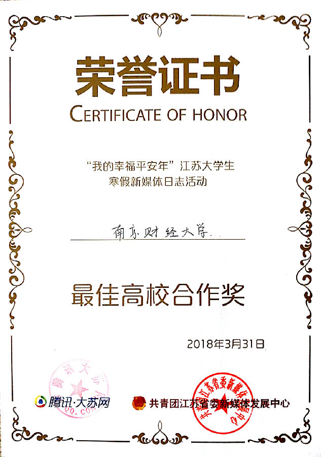 4月8日下午,由共青团江苏省委、腾讯大苏网联合举办的“我的幸福平安年”大学生社会实践颁奖典礼暨江苏大学生企鹅新媒体联盟成立仪式在南京师范大学举行,我校荣获江苏区“最佳高校合作奖”。