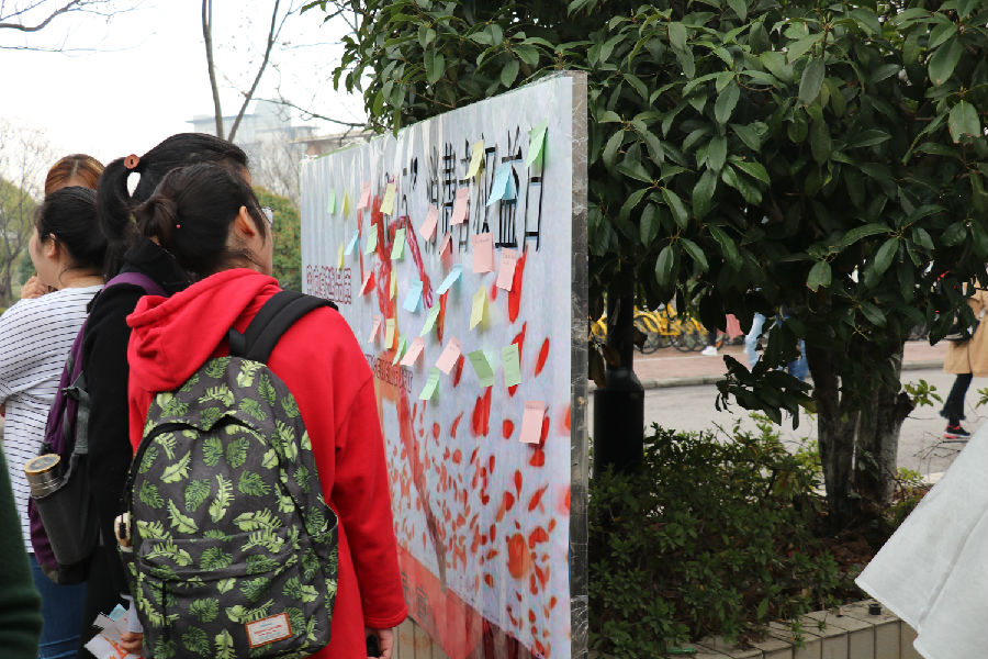 活动伊始,精美质量知识宣传单和引人注目的海报吸引了大量同学驻足围观、参与。在工作人员的引导下,同学们争先恐后地参与质量知识有奖竞答,如“完全不含人工化学合成物的农药、肥料、生长调节素、催熟剂、家畜禽饲料添加剂的食品叫什么食品?”“‘三无’食品是指哪三无?”“根据《刑法》规定,生产销售伪劣商品罪的最高刑罚是什么?”“‘顾客满意’的含义是什么?”也有的同学在便利贴上写下自己迫切想了解的质量相关的问题,如“如何快速判别奶粉中是否添加了三聚氰胺”“化妆品中常见的有害成分有哪些?如何鉴别?”“本色纸巾和白色纸巾哪个质量更好”“食品药品过了保质期还能吃吗?”,然后将写好的问题贴至海报,后期工作人员遴选有价值的问题予以解答,以普及质量知识。