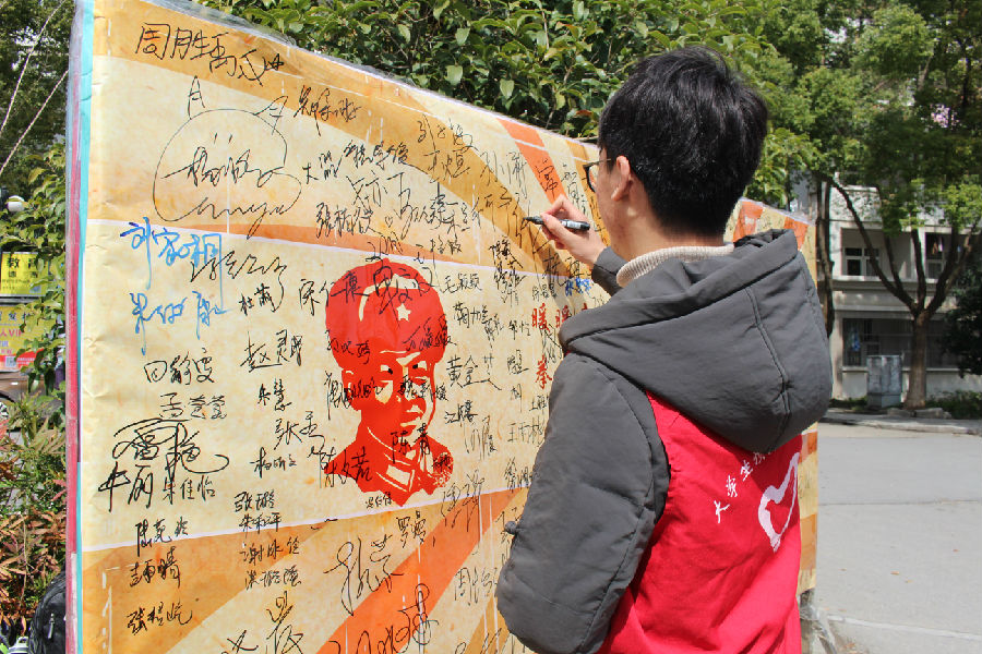 同学们在“雷锋精神我传承”的海报上签名 青年志愿者协会供图