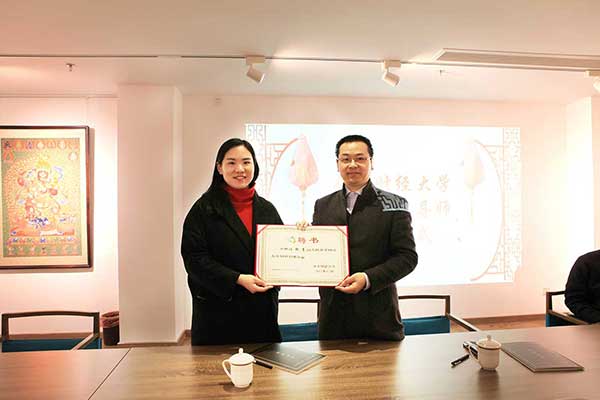 签约仪式上,陆华良处长向耿奇女士颁发南京财经大学大学生创新创业导师聘书,双方签署合作协议。学生代表为“南京财经大学——江南丝绸文化博物馆创新创业教育基地”揭牌。