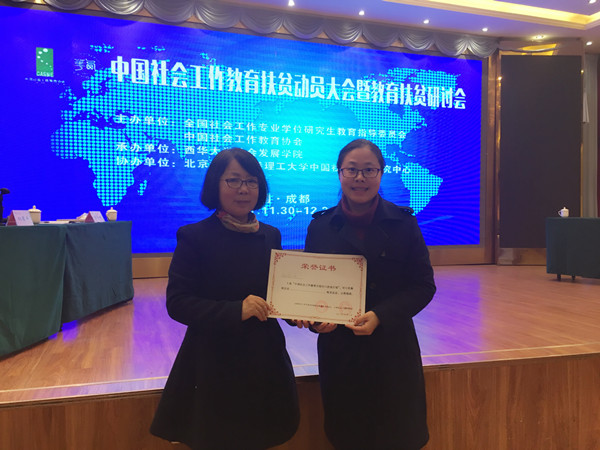 近日,由中国社会工作教育协会主办,西华大学社会发展学院承办,北京大学——香港理工大学中国社会工作研究中心协办的“中国社会工作教育扶贫动员大会暨教育扶贫研讨会”在成都举办。我校法学院社会工作系成为全国首批入选“中国社会工作教育百校对口扶贫计划”单位,法学院社会工作系主任许芸副教授参加会议并领取对口扶贫任务书。