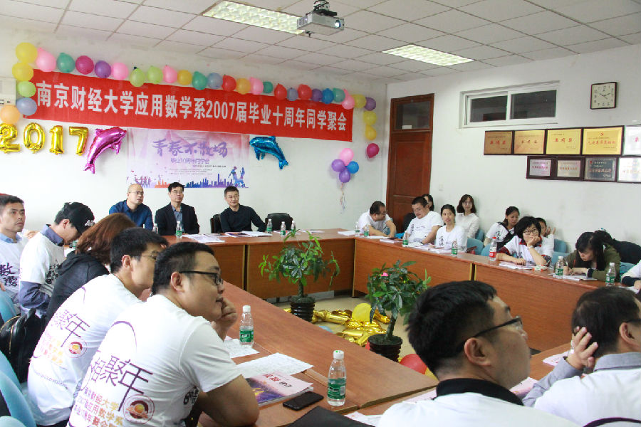 10月3日,2007届应用数学系同学载着五湖四海的芬芳,重返母校的怀抱,参加毕业十周年纪念活动。上午十点,校友们齐聚在仙林校区德业楼534会议室,举行毕业十周年师生座谈会,张从军教授、时洪波教授、辅导员洪本云老师和2007届的校友参加了本次座谈会。张从军教授介绍了十年来学院的变化和在人才培养方面的丰硕成果。时洪波教授向校友表达了母校、学院对校友的思念与期盼,希望校友有时间常回母校看看。洪本云老师回忆了与同学们共同度过的大学时光。座谈会上各位校友介绍了在十年中取得的各种成绩,分享了其中的辛酸苦涩与收获,并将勉励之语送给在校学生们。校友们希望下一个五年、十年大家能再相聚,畅谈同学情,再续南财缘,为母校的发展贡献自己的力量。