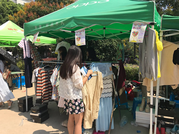 项目组前期走访了仙林大学城大成名店公园,获得了花笙馆、伊风行等商店捐赠的全新、库存积压商品,共有衣服50余件和鞋子500余双。商品以低价出售,吸引了我校不少教职员工前来淘物献爱心,也有许多师生不为购物只为捐款而来。义卖活动也吸引了其他院的学生志愿加入,“这是很有意义的活动,大家既可以买到自己心仪的东西,同时又奉献了爱心”,来自粮食工程专业的吴柯同学加入了义卖行列。“找商家捐赠是指导老师许芸副教授的点子,一开始抱着试试看的心态,没想到找的商家都很乐意,为这些免费捐赠的商家点赞。”负责本次活动的法学院社工1601班尚俏燚介绍说。