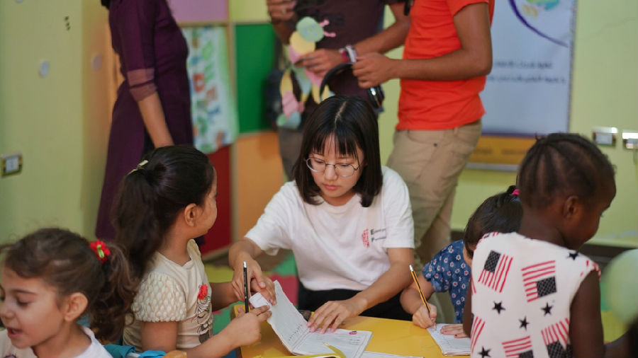 陈楠同学辅导难民小朋友学习英语