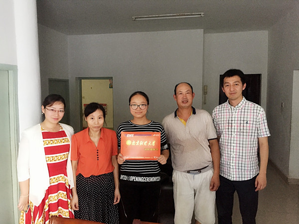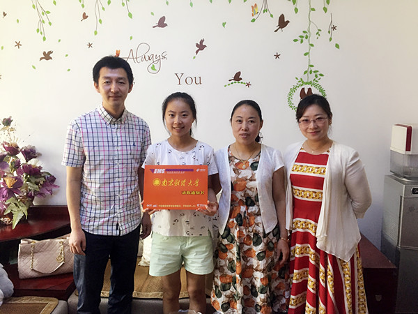 7月28日,我校招生办主任衣琳,外国语学院党委副书记李慕原、教务科研办主任潘华一行前往无锡、江阴,向外国语学院2017级新生倪星愉、吴荣慧同学发放录取通知书。