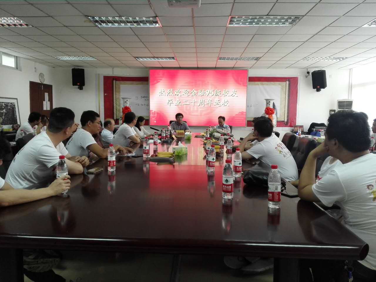 7月9日上午,值毕业二十周年之际,金融学院金融9501班(专)、9502班(专)一行56人冒着酷暑返回母校聚会。金融学院院长卞志村、学生处处长姚学峰、工商管理学院党委书记章莹、金融学院党委副书记张小荣及金融学院部分老师参加此次活动。原金融系系主任、现南京特殊教育师范学院院长凌迎兵教授发来祝贺视频。