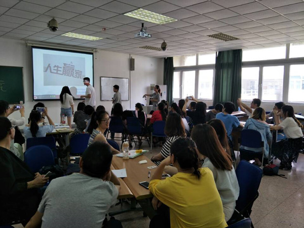 甘诺副教授的“最后一课”也是2017届毕业生们入学的第一课。社工实验室经过精心布置,展出了第一课时四个成长小组的自制海报,同学们又坐回最初的位置。最初的大学适应性课程,如今变成了职场适应性课程。甘诺副教授通过游戏,让同学们了解职场的竞争与规则,怎样才能成为职场真正的赢家。通过车轮图讲解了走入职场最需要的八种能力。