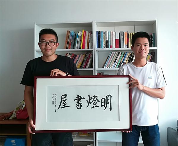 高永东副书记发言,他感谢2017届毕业生同学感恩母校的慷慨之举,并希望“明灯书屋”成为一代代新闻学子探讨读书、交流思想、头脑风暴的场所,让知识之光持久地照亮年轻学子的心灵。新闻学院2017届毕业生代表、已被英国利兹大学录取的陆宇其同学代表2017届毕业生将“明灯书屋”的牌匾授予2016级学生代表彭福远同学。高永东副书记宣布“明灯书屋”正式成立。