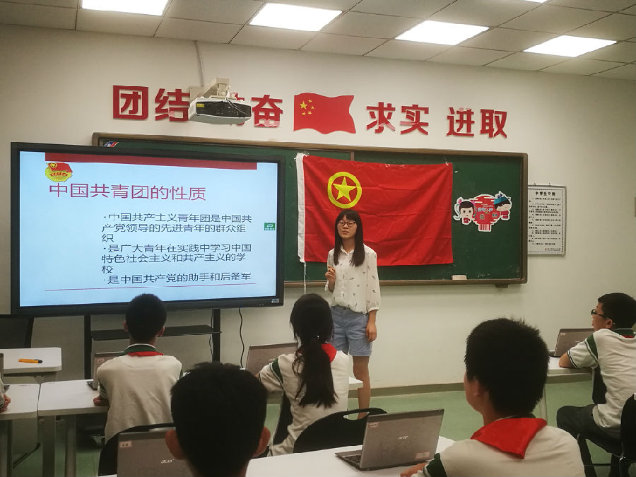 经统1501团支书李颖佳为同学们讲授了“入团第一课”。同学们通过一段微视频了解了中国共青团的发展历史,之后大家一起学习了团旗、团徽、团歌等基本团知识,最后她邀请同学们积极向共青团靠拢,成为一名光荣的共青团员。