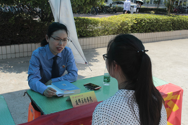 当日中午,法学院在仙林校区中苑食堂广场开展了普法宣传活动,现场设置了有奖问答、你画我猜、朗读不NG等活动,并邀请了建邺区检察院、栖霞区法学会、栖霞区司法局工作人员与同学们交流,答疑解惑。“霍某收到短信称,可以用手机积分换取话费,只要按短信提示操作就能成功换取话费,霍某该怎么办?”“王某在淘宝网上购物以后,很久都未收到东西,和网店客服联系,对方称因为淘宝升级未收到订单需要重新打款才能发货,王某该怎么办?”有奖问答环节,同学们积极参与问答,并通过活动识破诈骗套路;你画我猜环节,参与活动的同学根据“银行卡透支消费”“虚假中奖”“兼职刷单”“熟人借款”“编造亲人事故”等关键词进行演示并猜词;朗读不NG环节,参与活动的同学朗读了相关诈骗形式与防骗秘籍,提高防范意识。“如果被骗了如何维权?”“最近有哪些新的诈骗形式?”同学们纷纷向工作人员进行咨询。