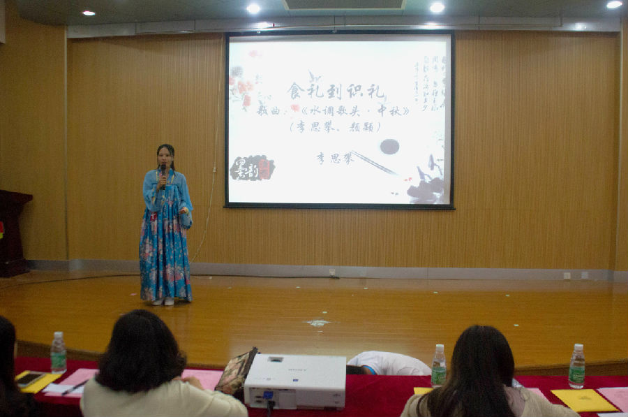 当晚的决赛共有开场秀、风采展示、国学常识问答、飞花令等多个环节。在风采展示环节中,选手身穿不同朝代、款式的汉服,围绕中国传统文化主题依次进行五分钟的演讲,同时各位选手还别出心裁地搭配了唱歌、舞蹈等精彩节目,给大家留下深刻印象。在国学常识问答环节,选手按现场抽签题号依次进行问答,内容涉及中国古代诗词、汉字书写等内容,全面考量选手们的国学知识水平,选手的从容不迫与才思敏捷赢得了观众们的欢呼。最后飞花令的环节,选手们围绕“月”“酒”“山”“水”等展开诗词语句的对决。随着比赛的深入进行,现场气氛也达到了最高潮。
