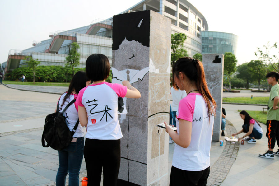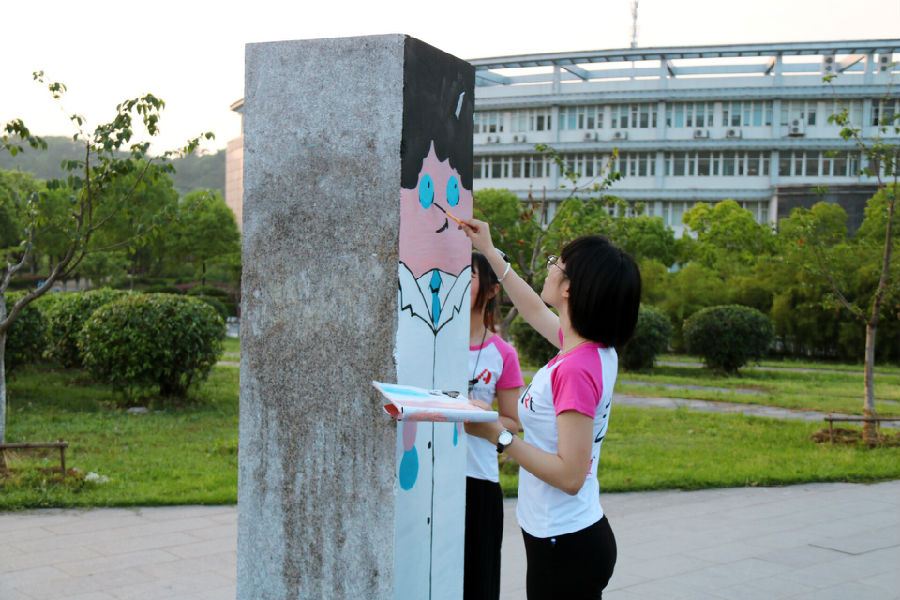谈到这次校园石墙石柱变身,艺术设计学院学生会主席林强介绍道:“石柱经常被校外的机构贴上‘小广告’,撕下来后又被贴上,有的甚至是喷上去的,更难去除。作为艺术设计专业的学生,我们觉得有责任用我们的画笔描绘校园景致。”从有了改造石墙石柱的想法,到创意方案落实,同时考虑景观周围和谐,材质,主题等各方面因素,同学们整整经历了近两个月的创作推敲和试验。