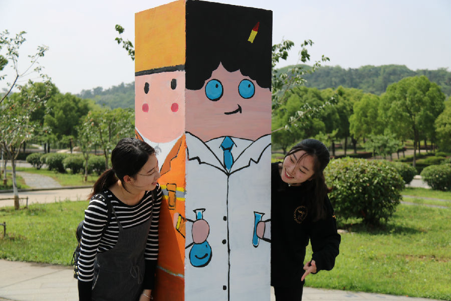 一个周末过来,路过理工学科楼后面广场的同学和老师有了一个惊奇的发现,原先冷冰冰的鹅卵石墙和贴满小广告的石柱悄然变了样:石墙变身为“梦想号”时光列车,石柱变身为呆萌的法官、化学家、记者、播音员、画家、老师等。原来,这是艺术设计学院学生的一次校园文化“艺术改造”活动。