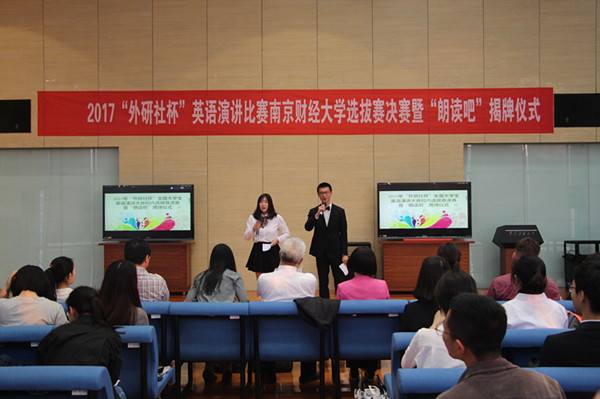 5月9日晚,2017“外研社杯”全国大学生英语演讲比赛南京财经大学选拔赛决赛暨“朗读吧”揭牌仪式在图书馆“世界之窗”举行。本次比赛是我校第十四届外语文化节的子活动,由外国语学院承办。校研究生处处长张为付,教务处副处长阚京华,外国语学院党委书记刘浩、院长肖辉,新闻学院黄一斓副教授,国际合作与交流处张楠老师,外教Andrew Voda担任了此次决赛的评委。