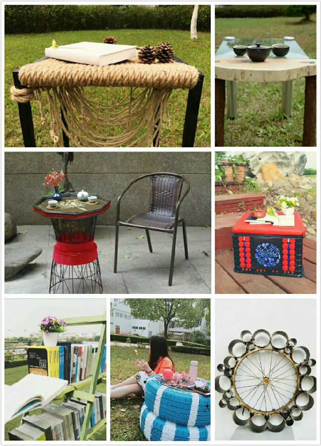 活动现场,同学们纷纷展示了自己和团队在指导教师的带领下用废弃物品精心打造的“家居”用品:有废弃汽车轮胎制作的炫酷“移动椅子”,有废自行车胎加上PVC水管打造的“摩天轮”,有用废弃木条和木板制作的“创意书架”,还有富有中国元素的茶桌、收纳盒等,作品展现了艺设学子别出心裁的创意灵感和心灵手巧的实践动手能力。