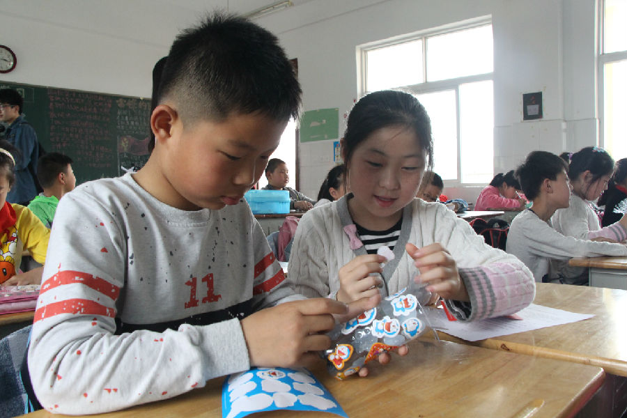 小学生们在认真制作笔筒