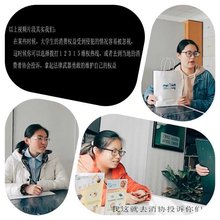 国际经贸学院学生拍摄大学生维权小视频帮助同学们了解更多的维权方式。开学伊始,同学们就投入到小视频拍摄的编稿、制作中。通过搜集生活中常出现的商家侵权行为,简化到视频中,将大学生权益受到侵害之后维权的过程演出来,据此广而告之维权的途径:拨打维权电话、网站投诉、网上报案等。组织此次活动的韩同学说:“3.15维权日,我们想通过自己的理解为我们身边的同学传递更多的法律知识来维护自身的合法权益,让大家知道如何解决自身权益受损的问题。”国际经贸学院党委副书记季霞表示,大学生社会经验少、阅历浅,懂法却不会用法的大有人在,在权益被侵犯时经常无可奈何,所以学院借助这样的活动形式去促使学生们自己去理解消费维权,学会正确地维护自身的合法权益。