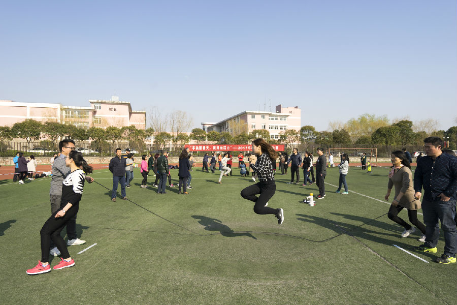 校工会举办的“享美丽春天 展阳光活力”——教职工“庆三八”跳长绳比赛在西苑运动场举行。赛前举行了一个简短而热烈的开幕式,副校长邱伟芬出席开幕式并宣布比赛正式开始,开幕式由校工会主席吕戎主持。来自18个分工会约200多名教职工参加了比赛。随着裁判的一声哨响,三组比赛同时开始。短短四分钟的时间里,绳索上下翻飞,跳绳的选手个个身手矫健,轻巧灵活,争分夺秒,充分发挥自己的特长与自己所在的团队配合;摇绳的选手注意力高度集中,努力配合着跳绳选手的节奏。有的代表队显然是有备而来,摇绳和跳绳的队员配合相当默契,几乎没有磕绊,令场外观众惊叹不已。经过六轮激烈的比赛,最终图书馆分工会代表队以绝对优势荣获一等奖;经济学院分工会代表队和红山学院分工会代表队荣获二等奖;国际经贸学院分工会代表队、后勤保障处(后勤服务中心)分工会代表队和法学院分工会代表队荣获三等奖。