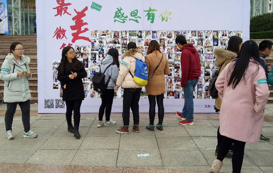 11月25日中午,我校仙林校区大学生活动中心前广场人头攒动、热闹非凡,由我校O-Club社团主办的“最美微笑——感恩有你相伴”活动在此火热进行。活动现场分为投票和宣传展示区、游戏区、嘉宾社团区。照片墙上同学们、宿管阿姨等校园内各行业工作人员独特的微笑吸引了众多学生驻足观看,并热情参与投票。游戏区中“找笑脸”与“搞笑三连拍”的游戏互动,令全场氛围热烈,高潮迭起。嘉宾社团区中,多个社团前来助阵,书画展示、动听的音乐、自制的糖果礼品以及神秘莫测的魔术表演大大丰富了活动的内容,让同学们得到身心的放松。本次活动通过海选筛选出部分照片参与线上、线下投票,最终将邀请老师与几位同学共同评选出“最美微笑”获奖者。此次活动在记录下同学们温馨而充实的大学生活的同时,也传播了积极的正能量,呼吁同学们感恩身边默默付出的人们。