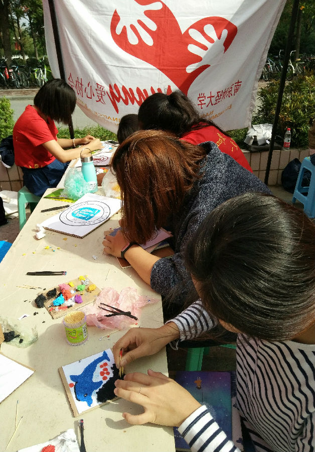 10月17日上午,我校仙林校区中苑食堂前广场人头攒动、热闹非凡,Sunny爱心协会在此举办以我校60周年校庆为主题的环保纸浆画制作活动。