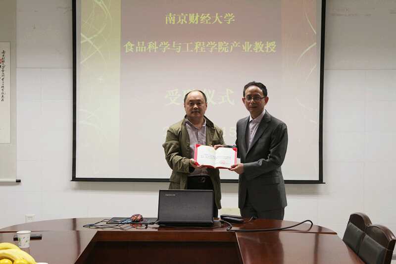 曹昌银为原南京粮食经济学院粮油储藏专业83级校友、上海侨基国际贸易有限公司董事长。仪式上,曹昌银深情回忆了在校生活,并讲述了毕业后个人的奋斗经历以及现在的事业发展情况,为母校60年校庆送上祝福。食品科学与工程学院院长胡秋辉介绍了学院近年来的发展概况,向曹昌银校友颁发了“南京财经大学食品科学与工程学院产业教授”聘书,希望他能常“回家”看看。