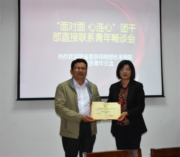 邱伟芬副校长为薛保刚副部长颁发荣誉团支部书记证书 校团委供图