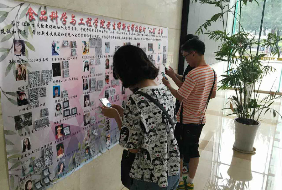 食品科学与工程学院开展了“老生带新生帮扶结对”活动,将学长学姐的专业、班级、家乡等信息贴在展板上,新生根据自身需要,扫描二维码添加微信,即可向他们咨询生活和学习上的疑问,让远离家乡的新生们感受到学校浓浓的温情。