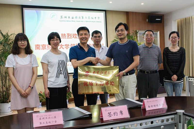 6月22日、23日,营销与物流管理学院党委书记陈进、院长倪明一行赴苏州、常州,分别与苏州市工业园区第二高级中学、吴江高级中学、江苏省前黄高级中学(常州)等三所四星级中学签订“南京财经大学优质生源基地”协议并授牌。苏州工业园区第二高级中学校长徐正伟、吴江高级中学校长李雪林、江苏省前黄高级中学校长孔建华等校领导参加仪式。25日、26日,该院又在安徽省合肥市第一中学、安徽省桐城中学建立优质生源基地。