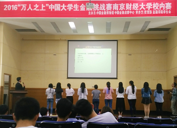 5月6日晚,由中国金融博物馆、中国金融启蒙中心联合主办,我校创业协会和金融学院协办的“万人之上”金融挑战赛校内赛决赛在仙林校区管理学科楼报告厅精彩上演。金融学院相关负责人担任评委,大赛组委会华东赛区总监夏天和我校学子一同观看了比赛。
