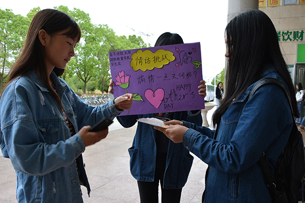 5月8日,国际经贸学院开展了母亲节“情话挑战”活动,随机邀请周边高校的路人们抽取情话卡片,现场打电话向妈妈说出情话卡片上的情话。活动组织者表示,希望通过这种方式,让更多的青年人对母爱的表达少一些害羞、多一些勇气。在食堂工作的李叔叔说:“我从来没有向我母亲说过感谢或者爱的语言,如今感慨子欲孝而亲不在,所以希望那些有父母在身边的人,多陪父母说说话,父母的养育之恩值得你们说再多的情话!”