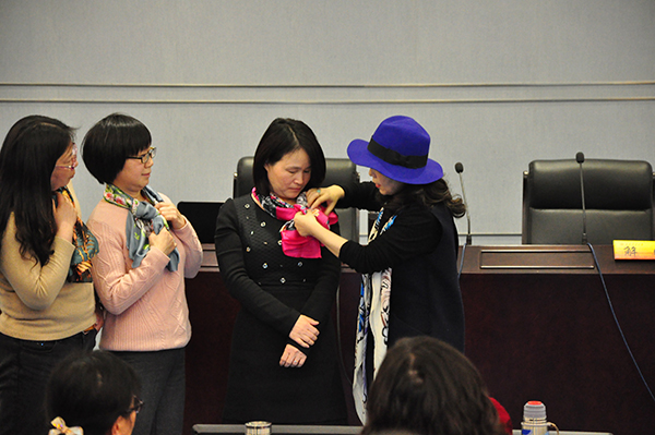 讲座最后,解晴女士还与老师们进行了现场互动,用漂亮的丝巾为女教职工当场扮美并进行现场展示,赢得大家热烈的掌声。