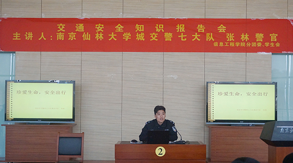 12月17日下午,应信息工程学院邀请,仙林大学城交警七大队的张林警官在我校仙林校区图书馆世界之窗作了题为“珍爱生命,安全出行”的交通安全知识讲座。讲座由信息工程学院党委副书记潘雪峰主持,信息工程学院部分师生参加了讲座。