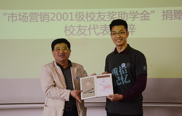 捐赠仪式上,营销011班校友们共同出资资助6名品学兼优的学生。校友代表薛斌发言,他希望学弟学妹们在今后的学习生活中严格要求自己,并祝福他们学有所成。