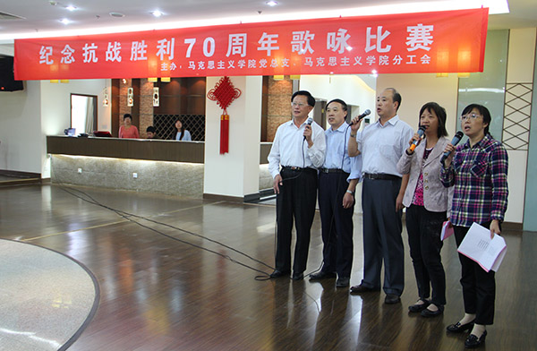 10月14日下午,由马克思主义学院党总支、分工会主办的纪念抗战胜利70周年歌咏比赛在仙林校区行政楼17楼校工会教工之家举行。马克思主义学院师生参加了比赛。校工会主席吕戎、外国语学院党委书记刘浩、艺术教育中心副主任(主持工作)段伟伟应邀担任评委。