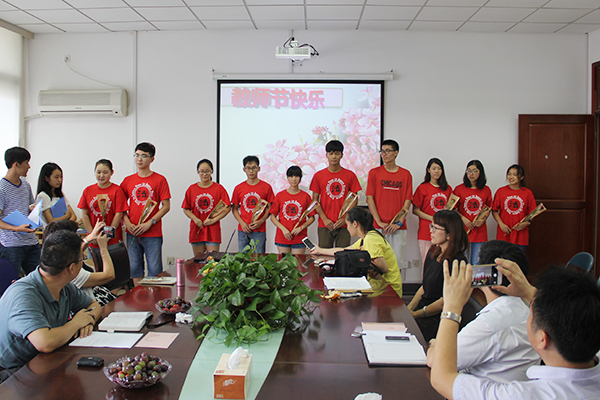 9月9日下午,法学院全体老师齐聚仙林校区法政学科楼435开会。门外,早已站好队形的学生代表们,身着红色院服,想等会议结束后给老师们一个惊喜。“风是你的歌,云是你脚步,无论白天和黑夜,都为人类造福。好大一棵树,绿色的祝福,你的胸怀在蓝天,深情藏沃土。”学生们终于等来了抒唱时刻,老师们则感动不已,眼泪泛着光:“做老师是最幸福的事!”