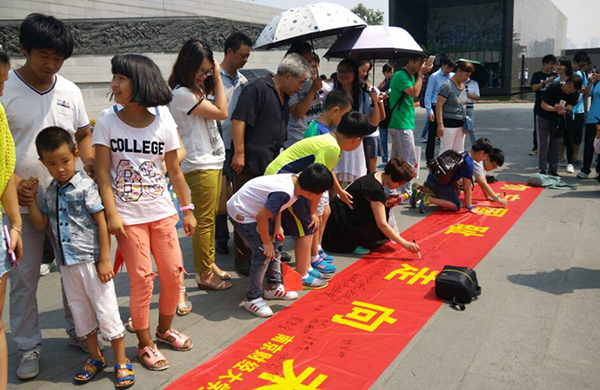 在和平广场前,同学们邀请市民在“勿忘国耻,走向未来”横幅上签字留念,希望他们能够珍惜和平,铭记历史。很多小朋友在家长的陪同下也庄重地签下了自己的名字,感受历史的沉重与和平的来之不易。
